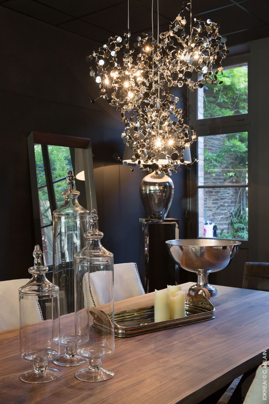 L’espace sur cour accueille un univers salle à manger feutrée dans une ambiance italienne très contemporaine et chic en bois et métal. Au centre, on trouve une grande table à manger avec un plateau spécial en bois de noyer, sur une base de pied géométrique en graphite. Elle est mise en valeur par des chaises raffinées aux lignes atypiques et à la tonalité naturelle, lin, très subtile. Au dessus de la table on est émerveillé par une suspension multifacettes, époustouflante de beauté et de raffinement. Une véritable oeuvre d'art unique, scintillante, faite de jeux d'ombres et de lumières.