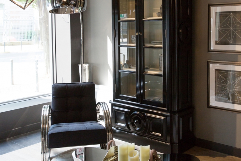La tonalité noir/tendre du Showroom, révèle la brillance et souligne les contrastes du mobilier et des accessoires : deux beaux miroirs avec encadrement en bois de noyer.