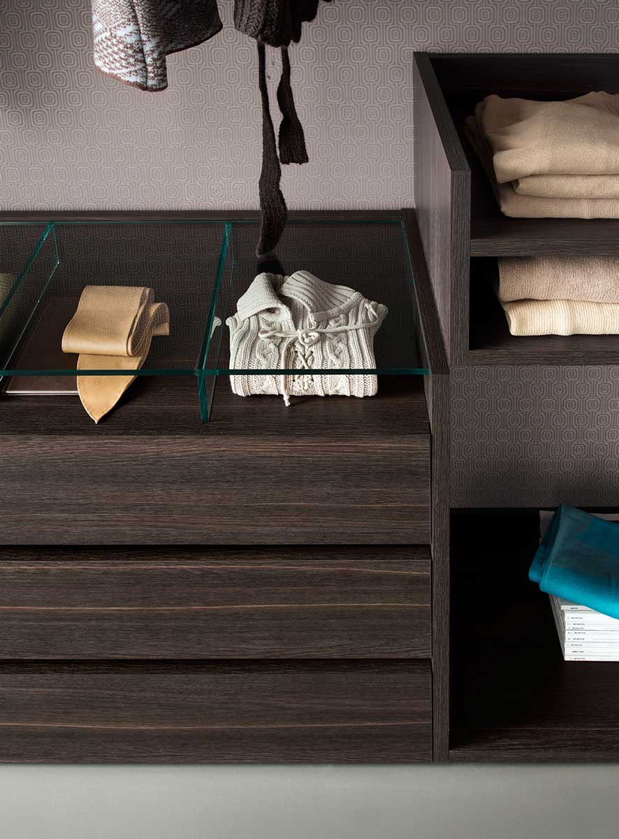 A proximité de la chambre, l’aménagement du dressing ouvert « à la carte » est composé de différents éléments : panneaux, étagères, corbeilles et paniers coulissants, porte pantalon et porte jupe et de nombreux tiroirs.
