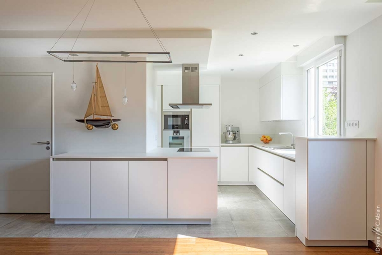 Cette cuisine ouverte, résolument contemporaine, est une parenthèse de pureté, en équilibre parfait avec les espaces de vie adjacents…