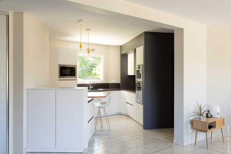 Le véritable enjeu a été d’intégrer harmonieusement et de façon originale cette cuisine ouverte à l’espace entrée et salon. La création de cloison et de bâti a été proposée pour encastrer les armoires, comme une manière de jouer avec leur profondeur. Ces éléments architecturaux ont ensuite été peints dans la même teinte que les murs juxtaposés, afin d’harmoniser l’ensemble avec le design intérieur de l’espace de vie. Ainsi, le réfrigérateur devient complètement masqué, hors du champ visuel lorsque nous sommes dans le salon séjour, bien caché derrière une nouvelle cloison accolée au semi-îlot.